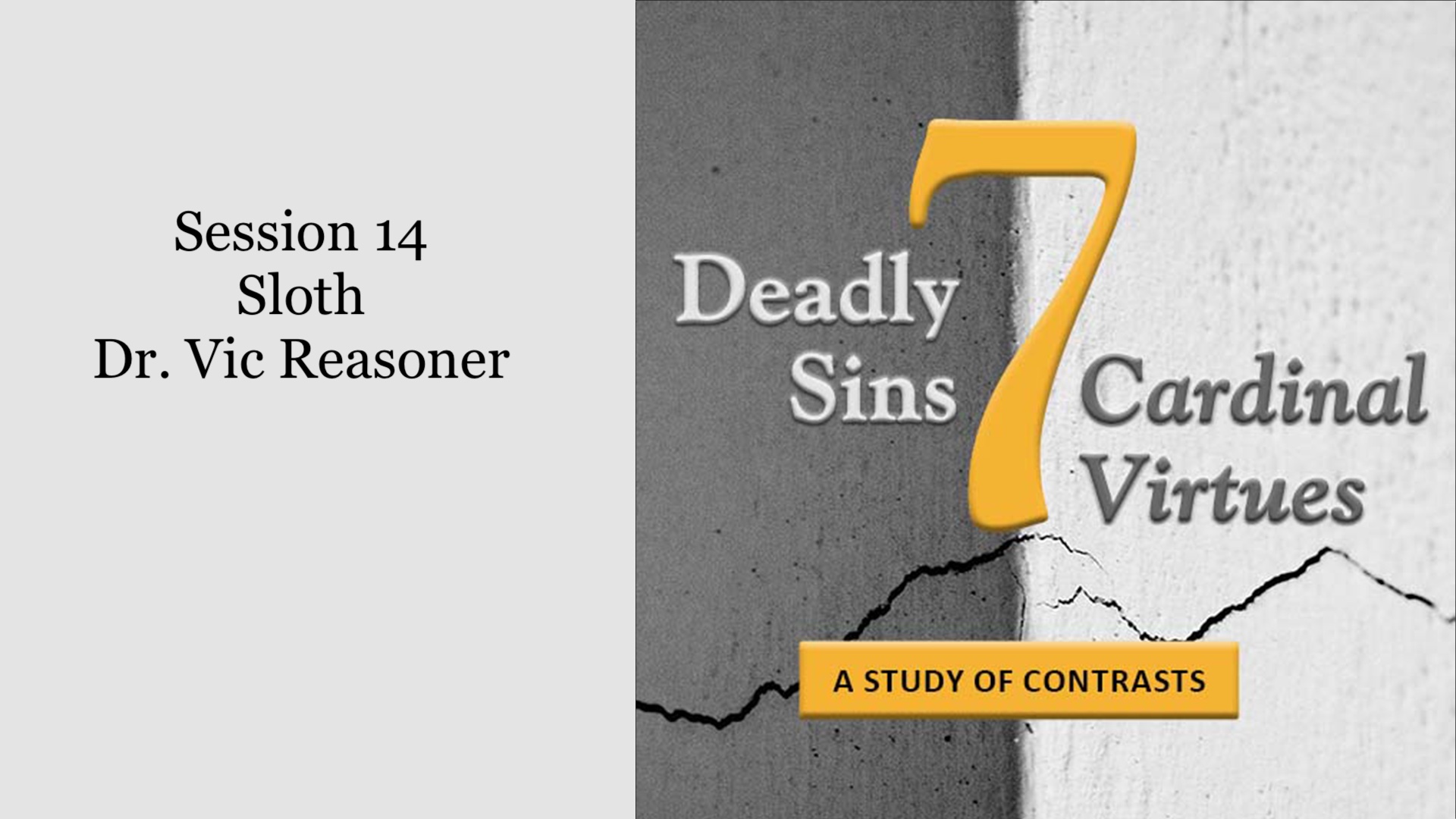 Dr.Vic Reasoner leads us through our 14th session on the 7 Deadly Sins and 7 Cardinal Virtues discussing the sin of Sloth.
